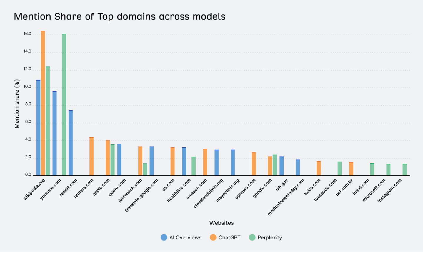 Google’s Overviews also favor Reddit (7.4%) and Quora (3.6%). These sites don’t show up in ChatGPT or Perplexity’s top 10.