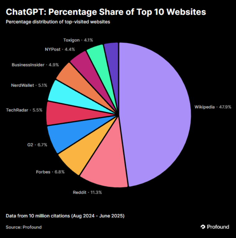 Wikipedia made up nearly half of ChatGPT’s top citations, about 47.9%.